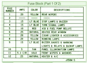 Fuse Panel Layout Diagram Parts: rear wiper, stop lamp, buzzer, turn signal lamp, fuel pump relay, heated rear window, cigar lighter, running lamp, warning light, back up lamps, panel illumination lamp, front wiper, washer, heater.