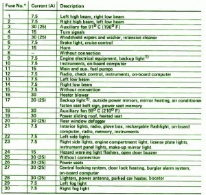 Fuse Panel Layout Diagram Parts: high beam relay, low beam relay, auxiliary fan, turn signal, windshield wiper/washer, intensive cleaner, brake light, cruise control, horn, engine electrical equipment, back up light, fuel pump, check control, instrument cluster, on board computer, heater blower, back up light, outside power mirror, mirror heating, air conditioner, power seat memory, rear window defogger, interior light, glove box, memory, rechargable flash light, hazard warning light, engine compartment light, license plate light, power antenna, parked car heater, fog light.